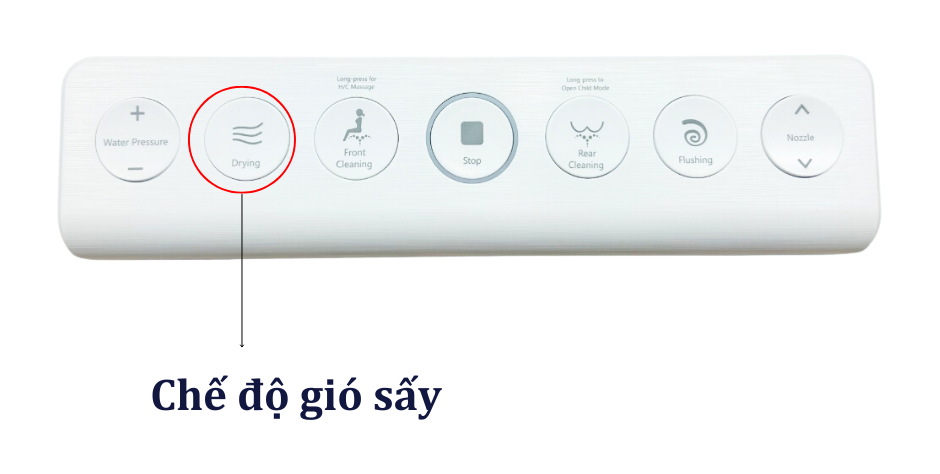 - Sau khi rửa, nhấn nút Gió sấy để kích hoạt tính năng làm khô vùng tiếp xúc.