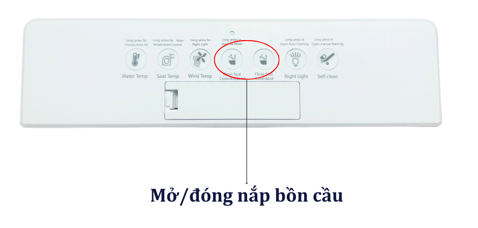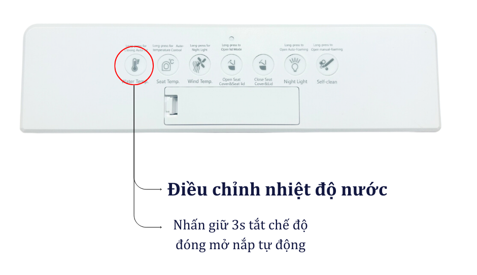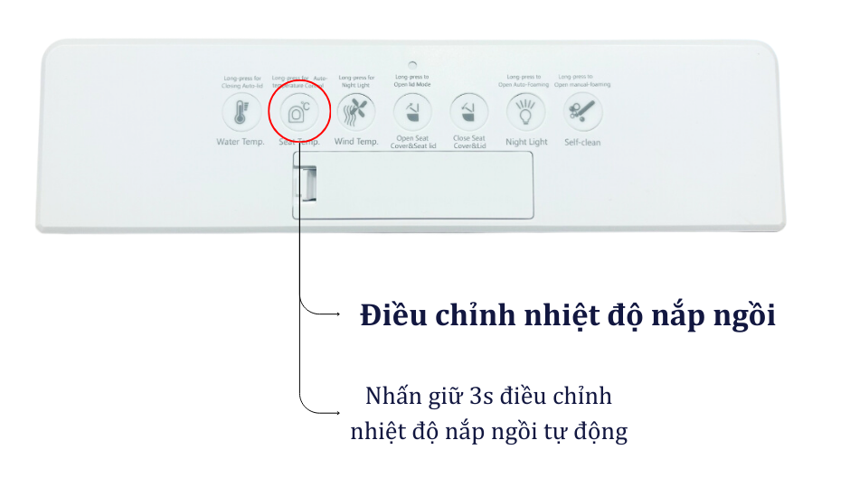 - Nhấn giữ 3 giây: Điều chỉnh nhiệt độ nắp ngồi tự động