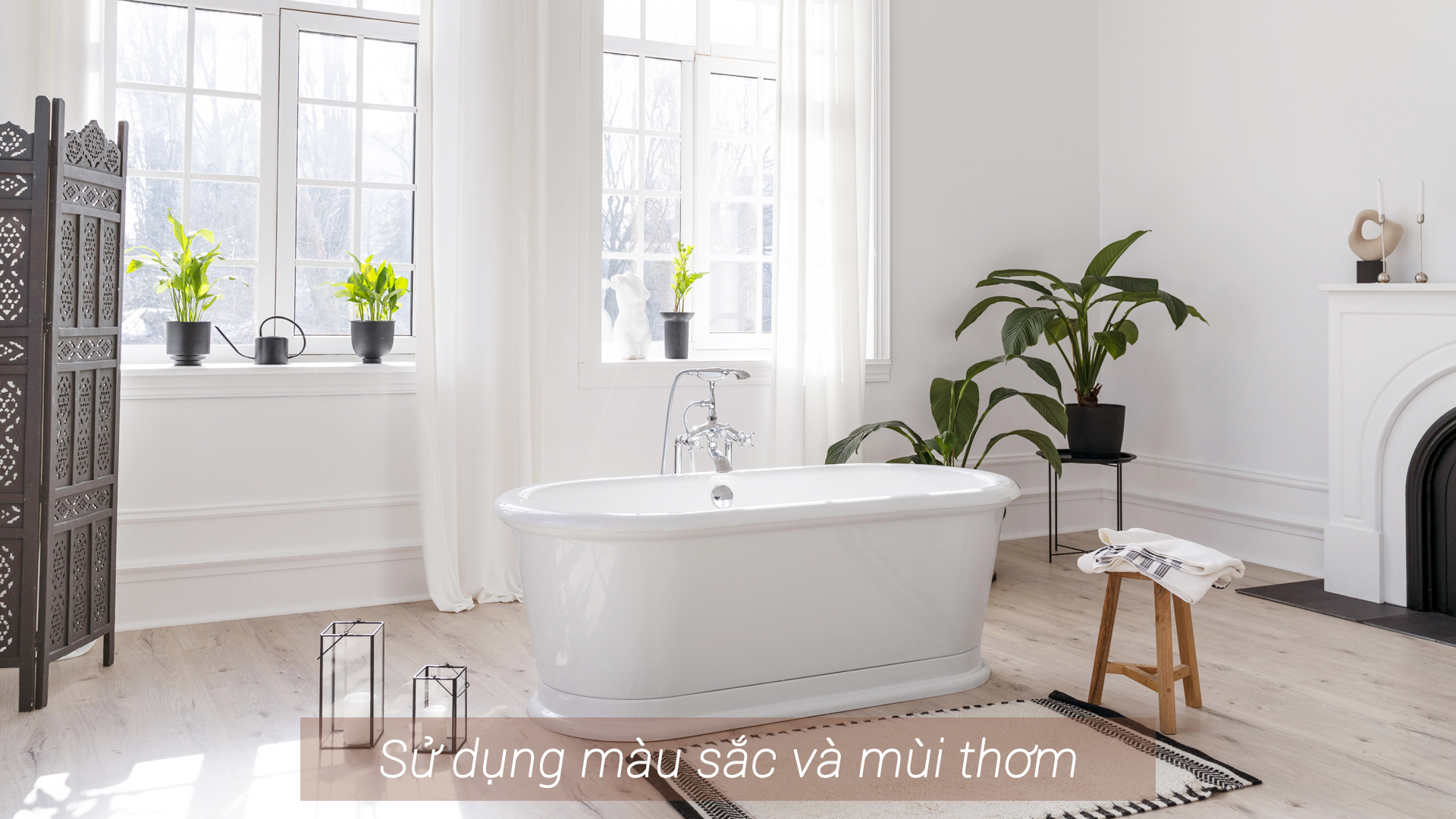 Ngoài việc tận dụng màu sắc từ sơn tường, đồ đạc, vật dụng trong phòng thì việc dùng ánh sáng của đèn để tô điểm và làm nổi bật thêm màu sắc là rất quan trọng. Ngoài ra, khi đặt thêm những chậu cây xanh cũng khiến gian phòng thêm ấn tượng và thu hút. Mùi thơm cũng là yếu tố không thể thiếu. Mùi hương cỏ thơm cũng được ưa chuộng để nâng cao vận khí trong không gian phòng tắm. Những tinh dầu thơm nhẹ nhàng như hương hoa nhài, hoa oải hương hay hoa hồng được ưa thích nhất.