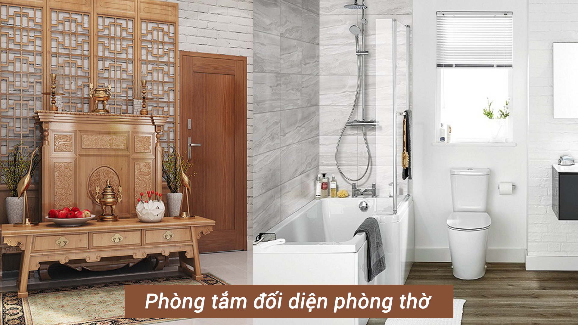 Theo phong thủy khi thiết kế phòng tắm ở vị trí đối diện với vị trí đặt bàn thờ là không tốt bởi những khí xấu sẽ phạm vào nơi linh thiêng. Nhà tắm và bồn cầu vệ sinh thường được thiết kế liền nhau, nếu bạn không trang bị tốt những hệ thống hút mùi thì khí uế sẽ lan tràn khắp không gian ngôi nhà gây nên sự khó chịu cho mọi người.
